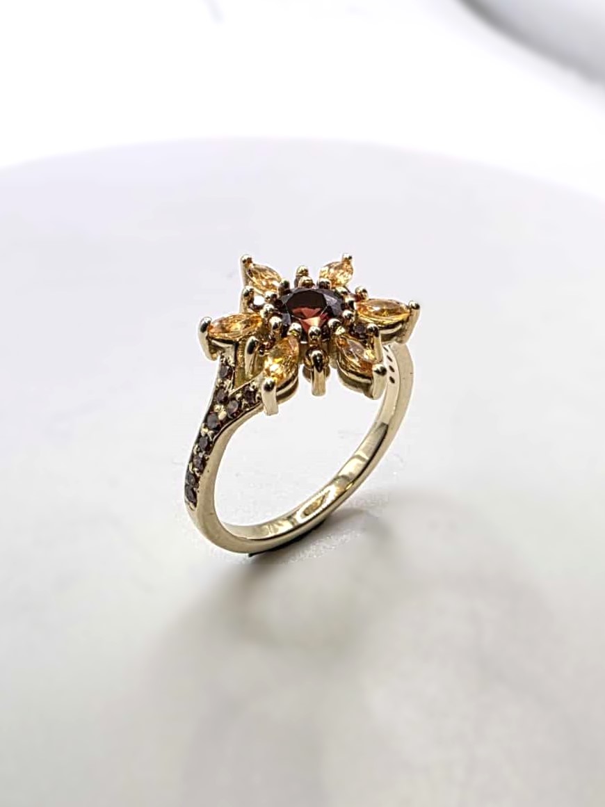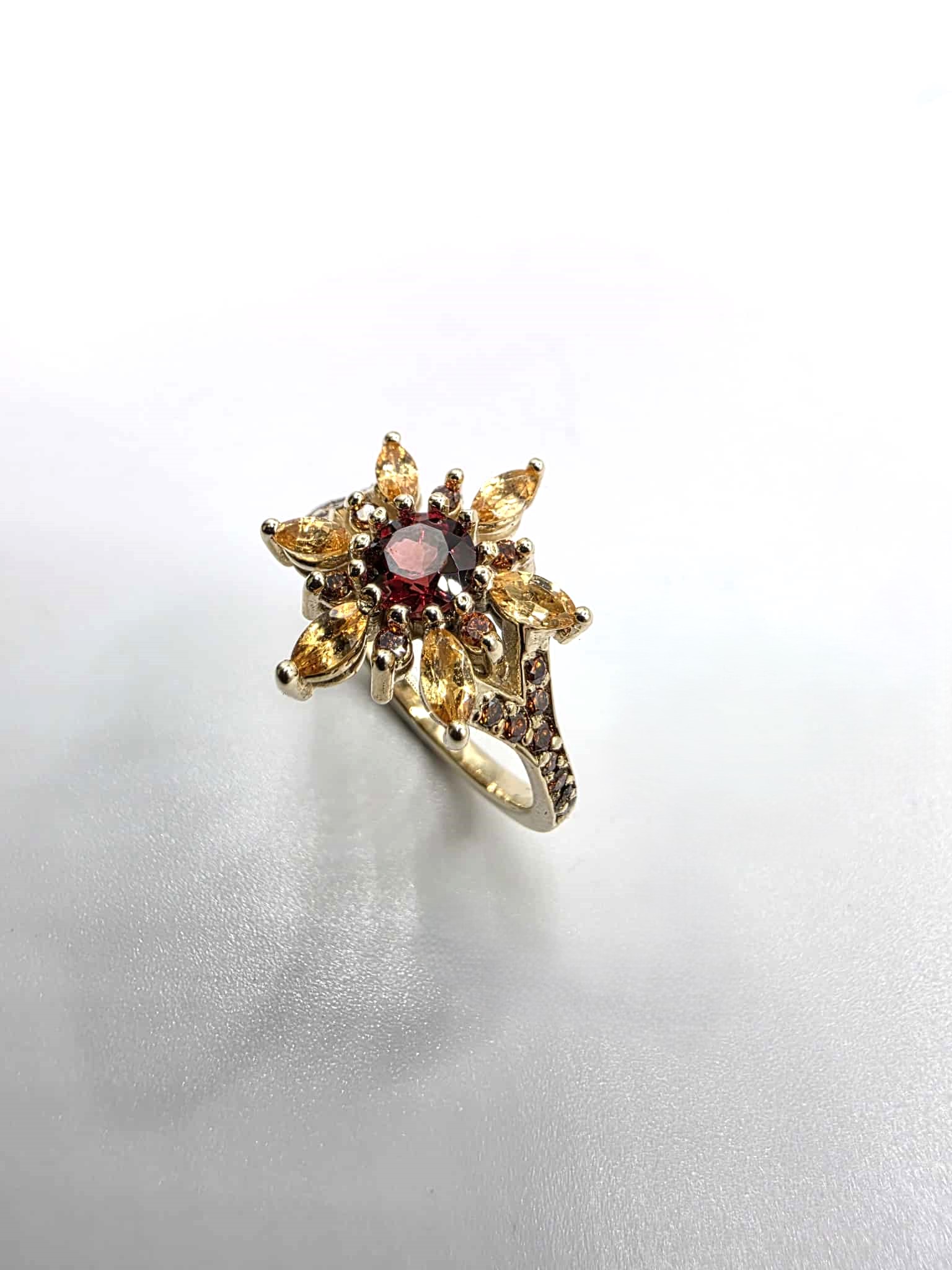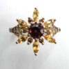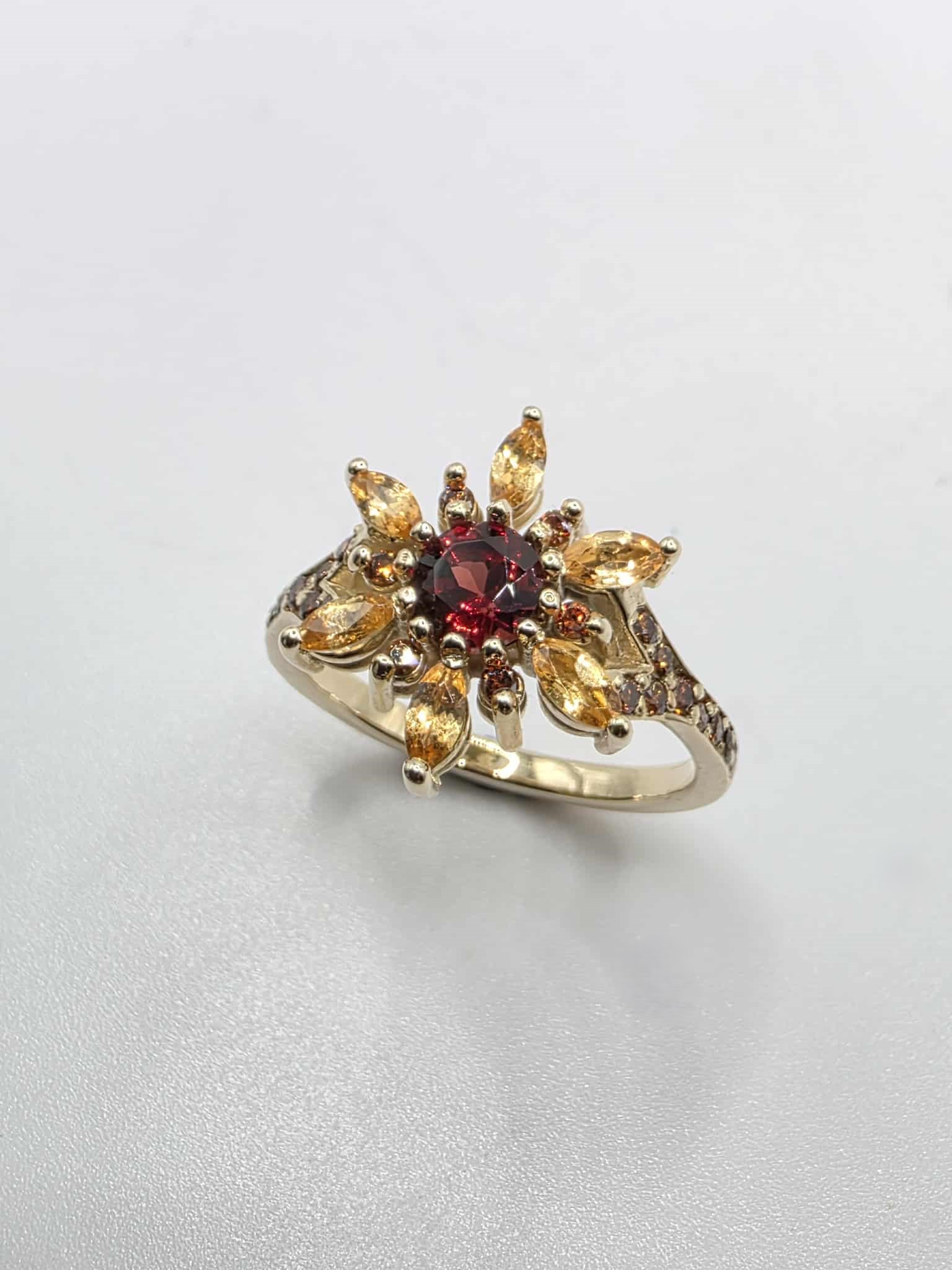 Magnifique bague en or jaune 10K sertie de grenats mozambique et spessartite ainsi que de diamants orange.