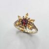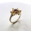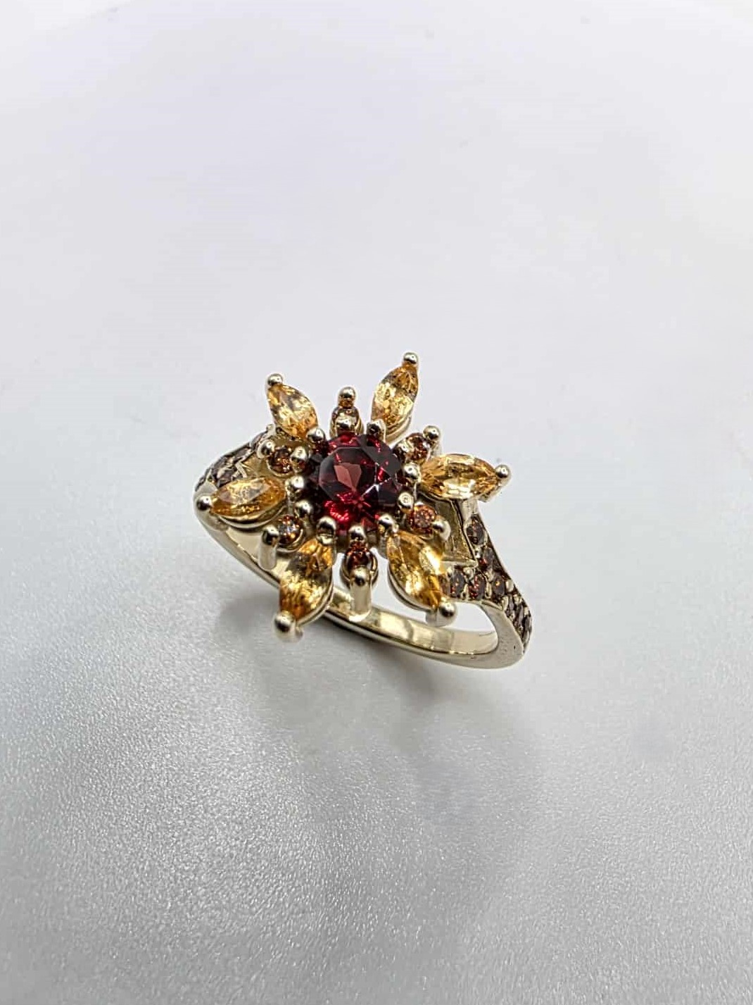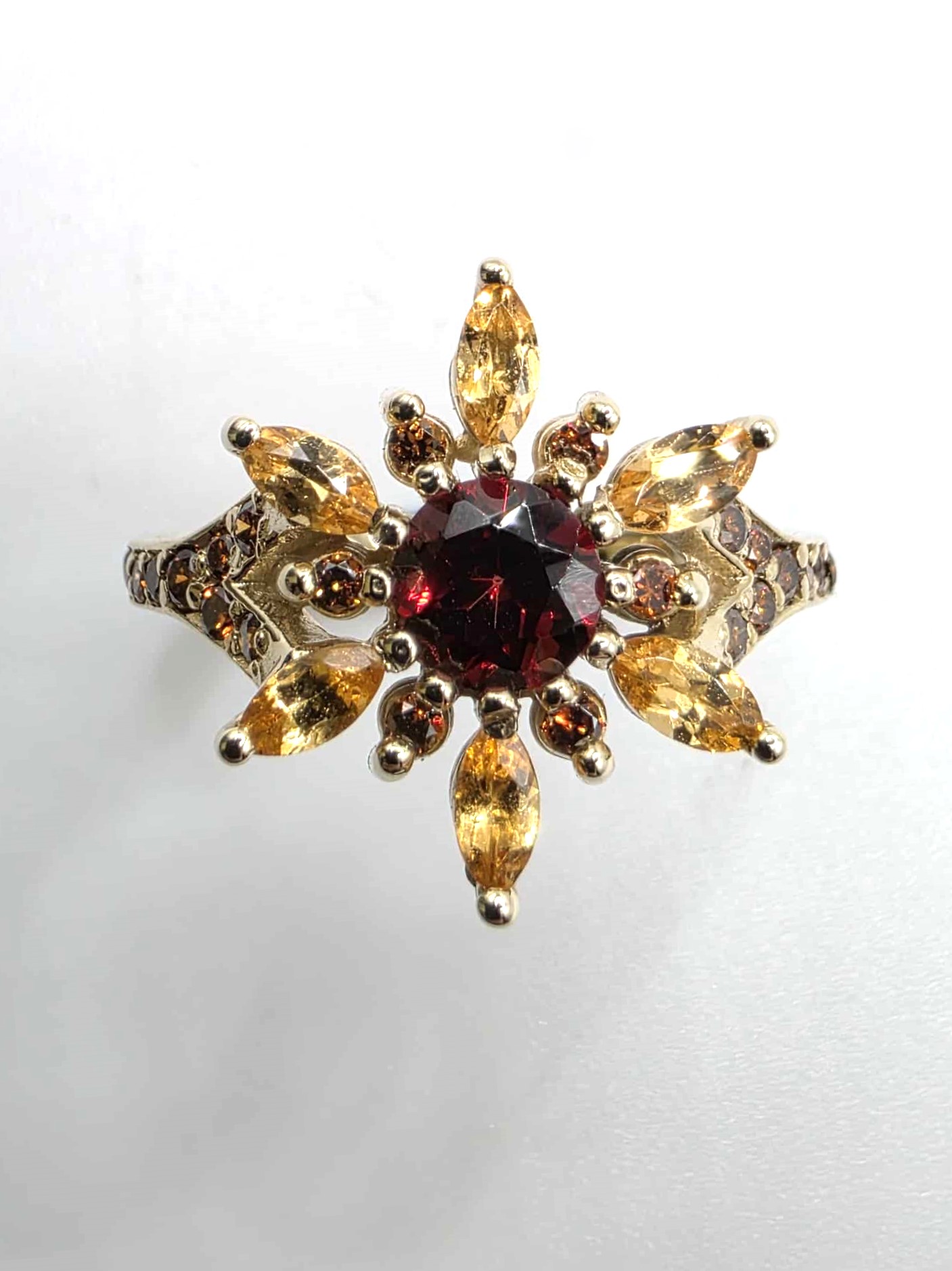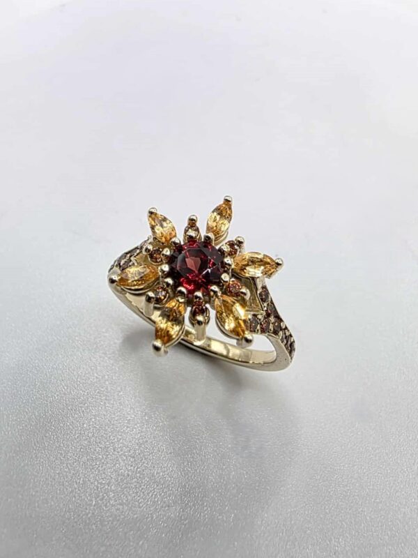 Magnifique bague en or jaune 10K sertie de grenats mozambique et spessartite ainsi que de diamants orange.