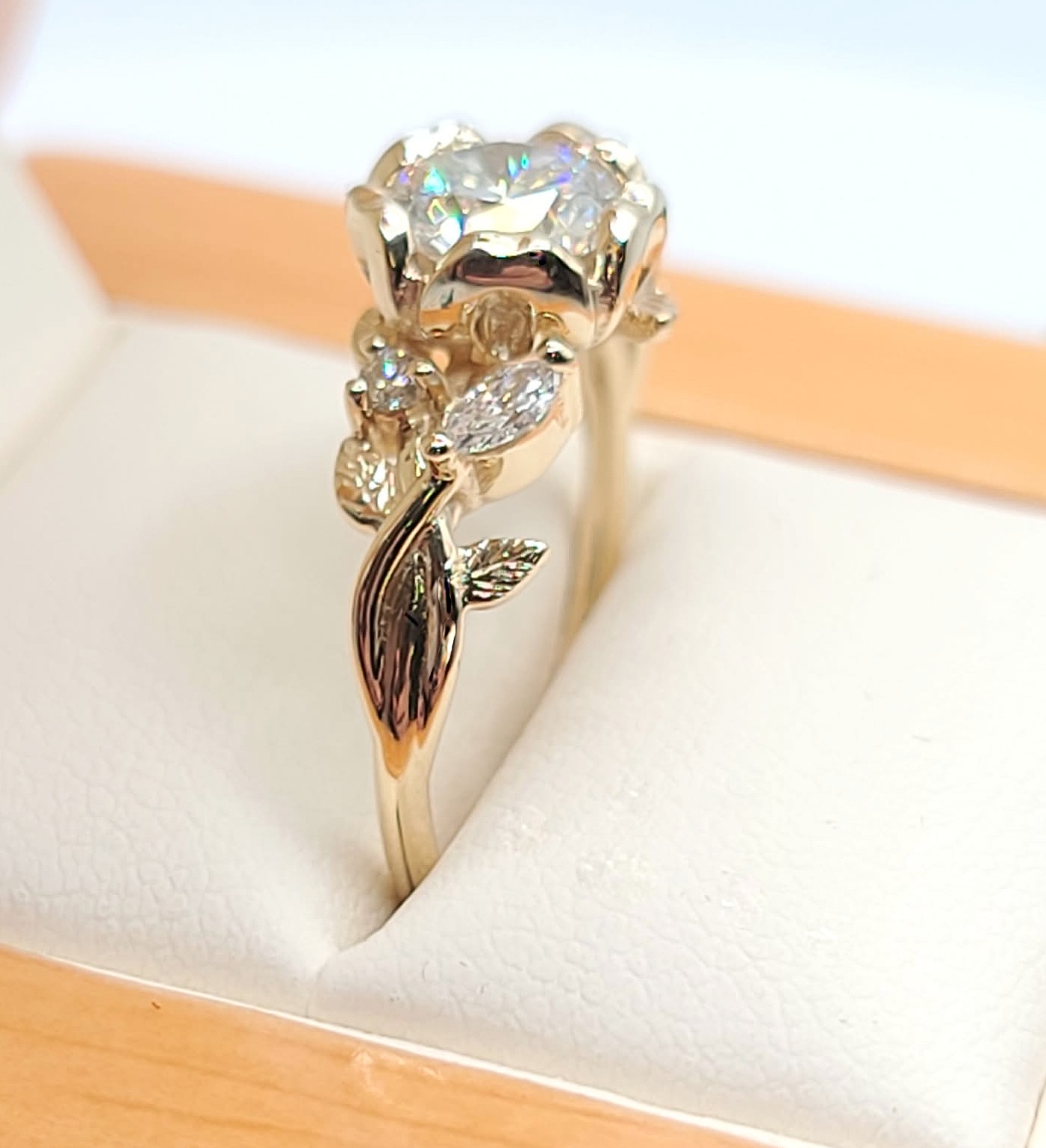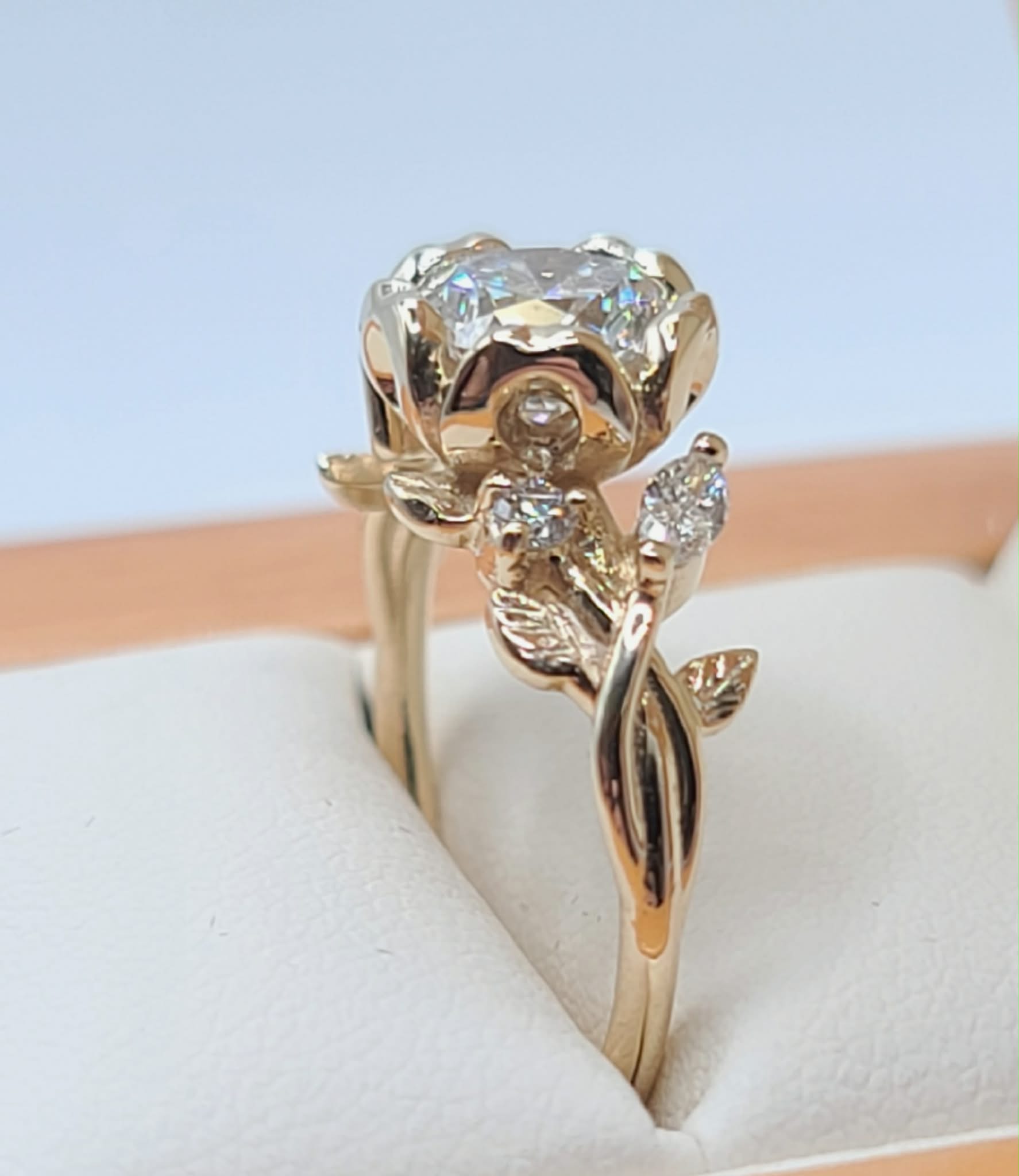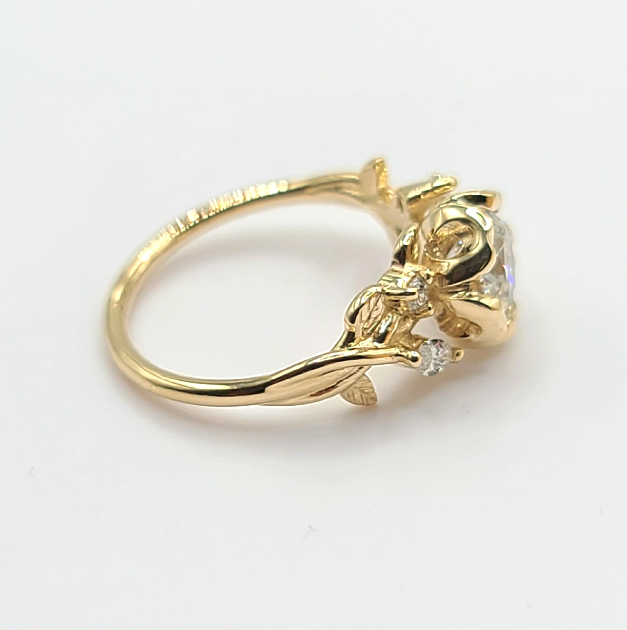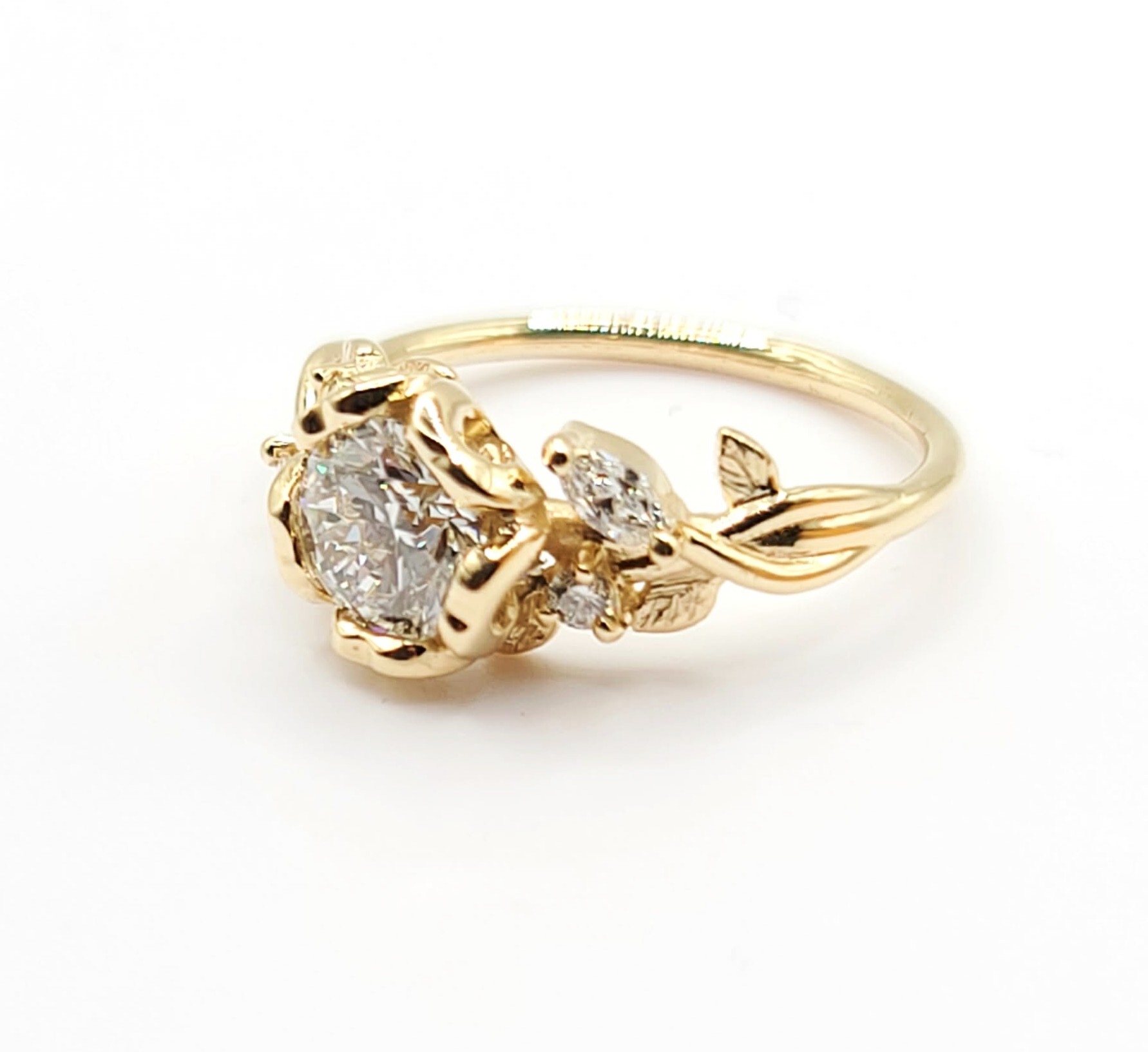 Inspirée d’une rose en pleine éclosion, cette bague en or 10k met en valeur un diamant central de 1 carat.